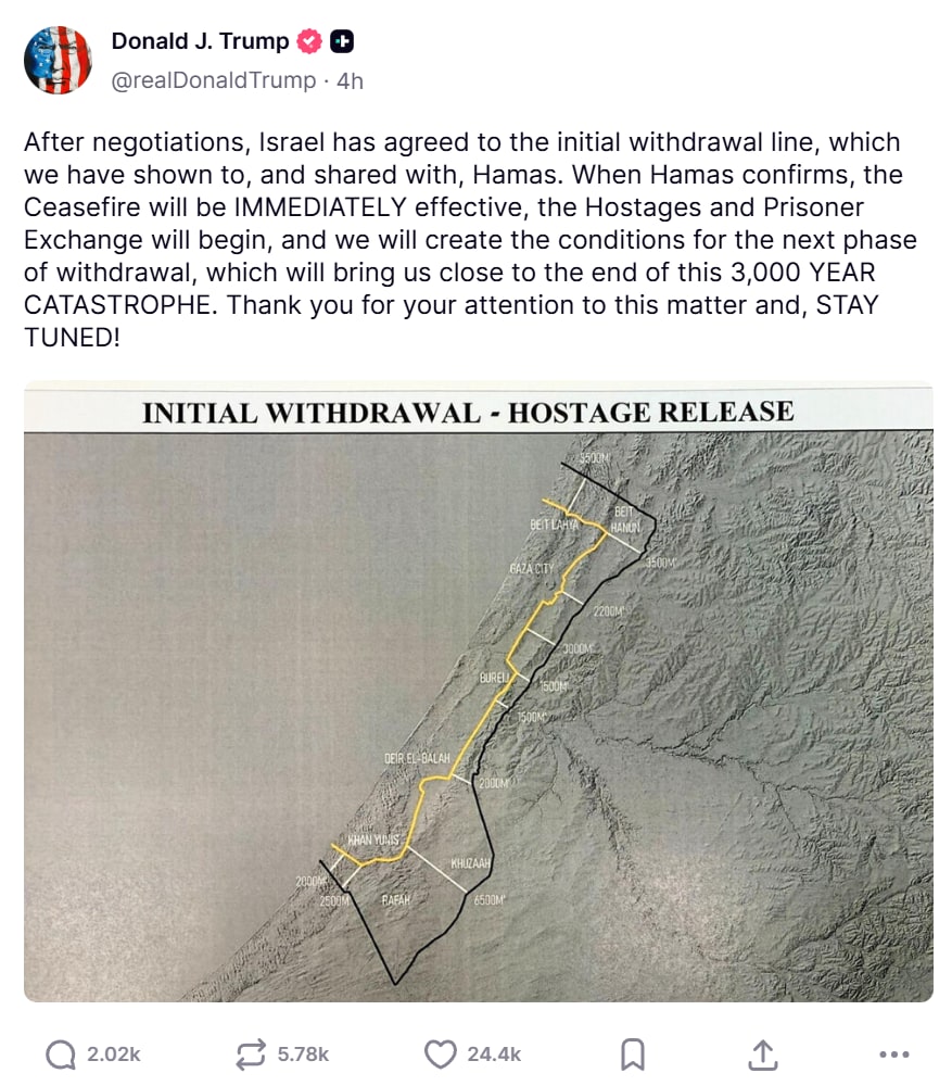 Trump posted earlier about an “initial withdrawal hostage release proposal.” He said Israel has agreed to the initial withdrawal line which has been shown to and shared with Hamas. When Hamas confirms, the ceasefire becomes effective and the hostages/prisoner exchange begins. Then, “conditions for the next phase of the withdrawal” would bring us closer to the end of a 3,000-year catastrophe.